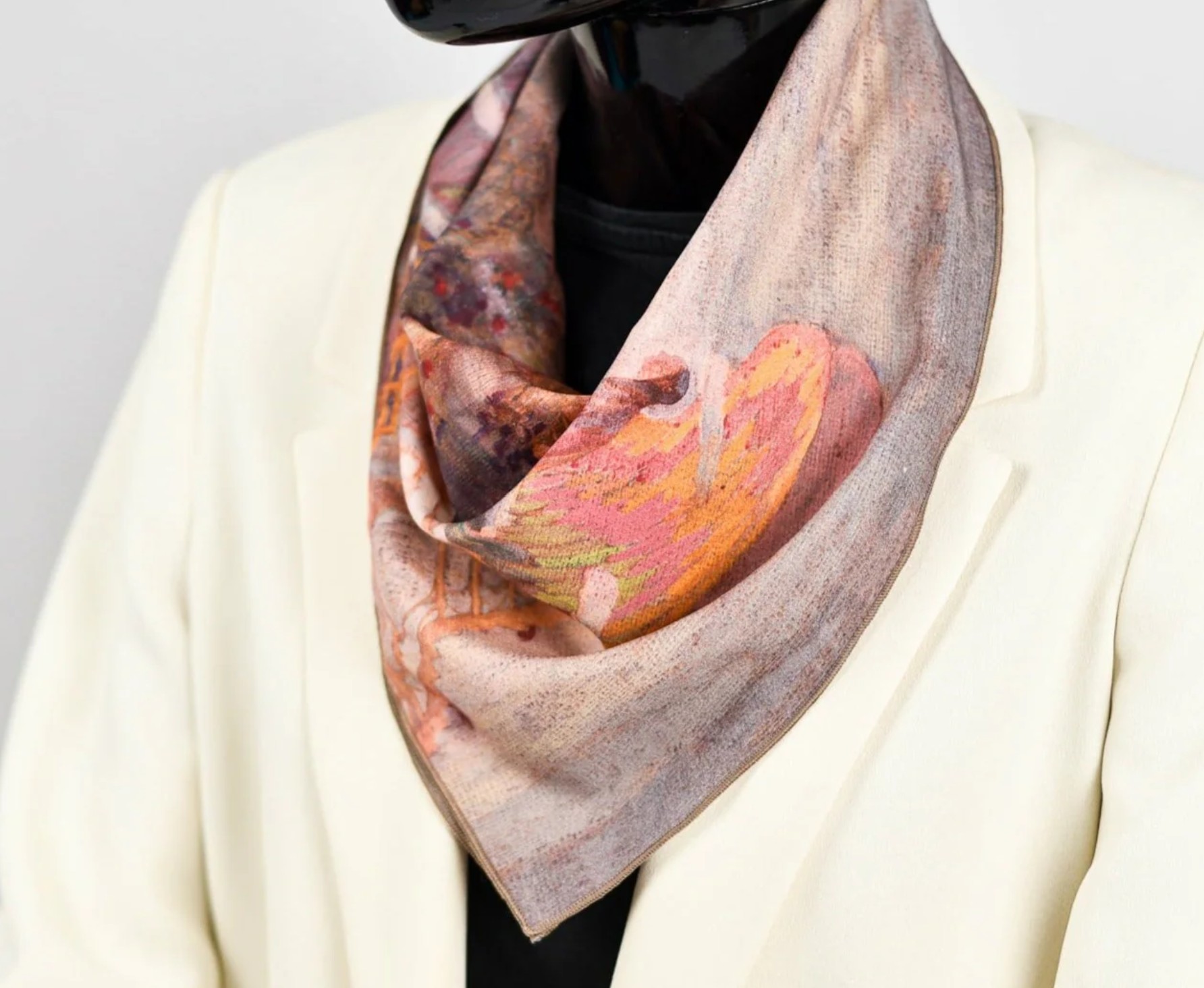 Elegantiška skarelė su M. K. Čiurlionio paveikslo „Angelo preliudas“ motyvu – tai subtili meno detalė, kuri praturtins jūsų įvaizdį ir kasdienybę. Ji puikiai tiks tiek sau, tiek kaip išskirtinė dovana artimam žmogui. Skarelės kampe yra subtiliai įkomponuotas užrašas DRUSKININKAI.